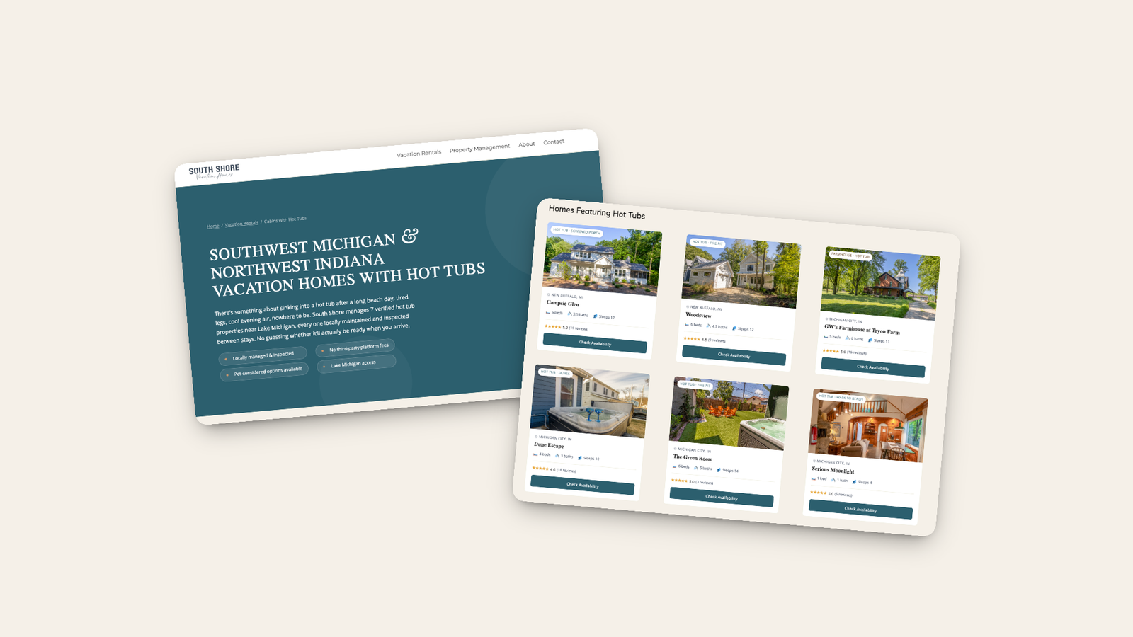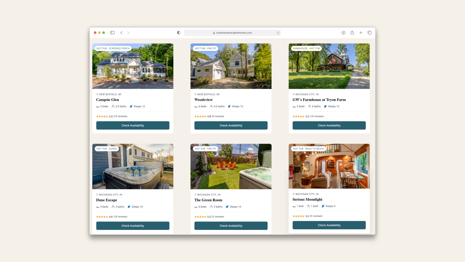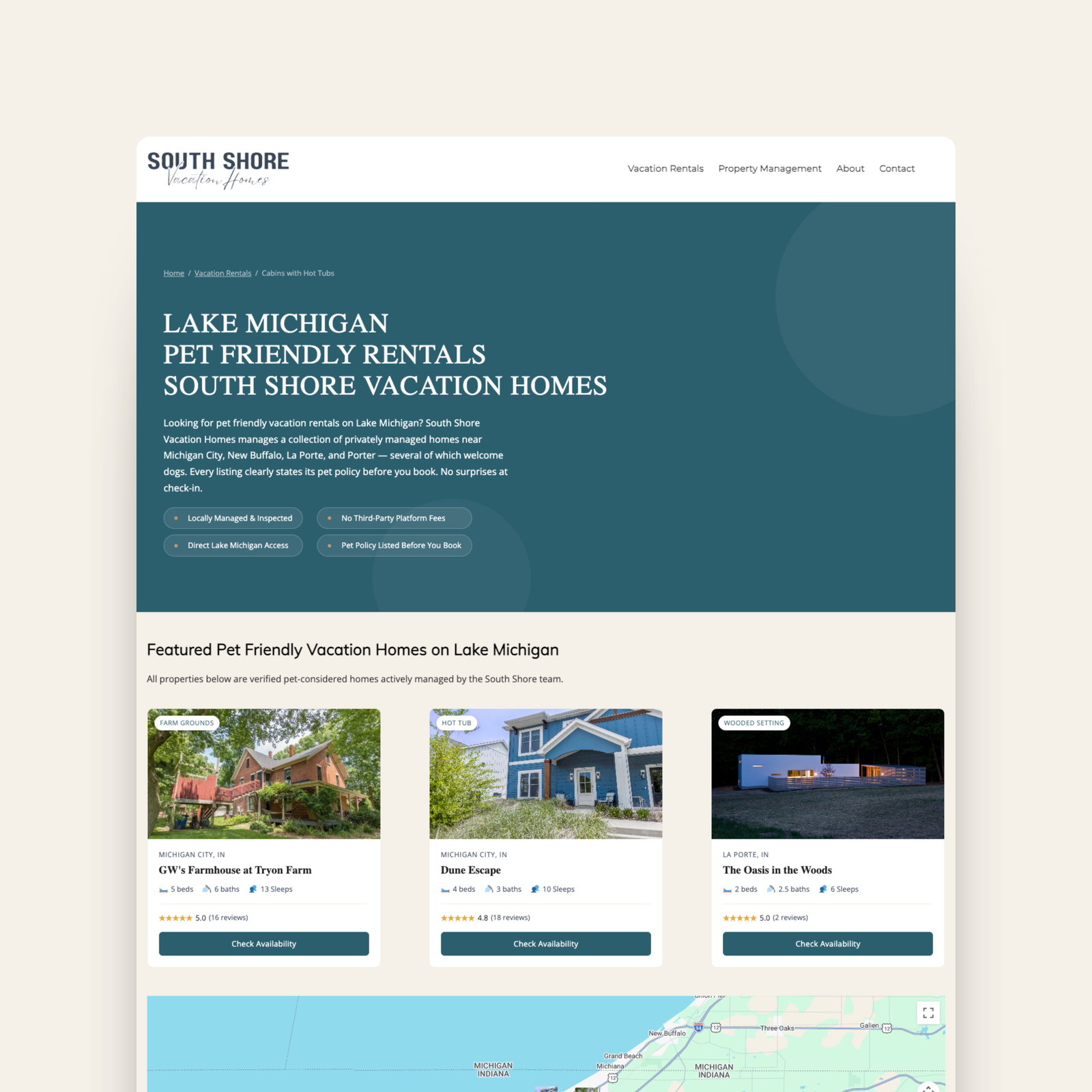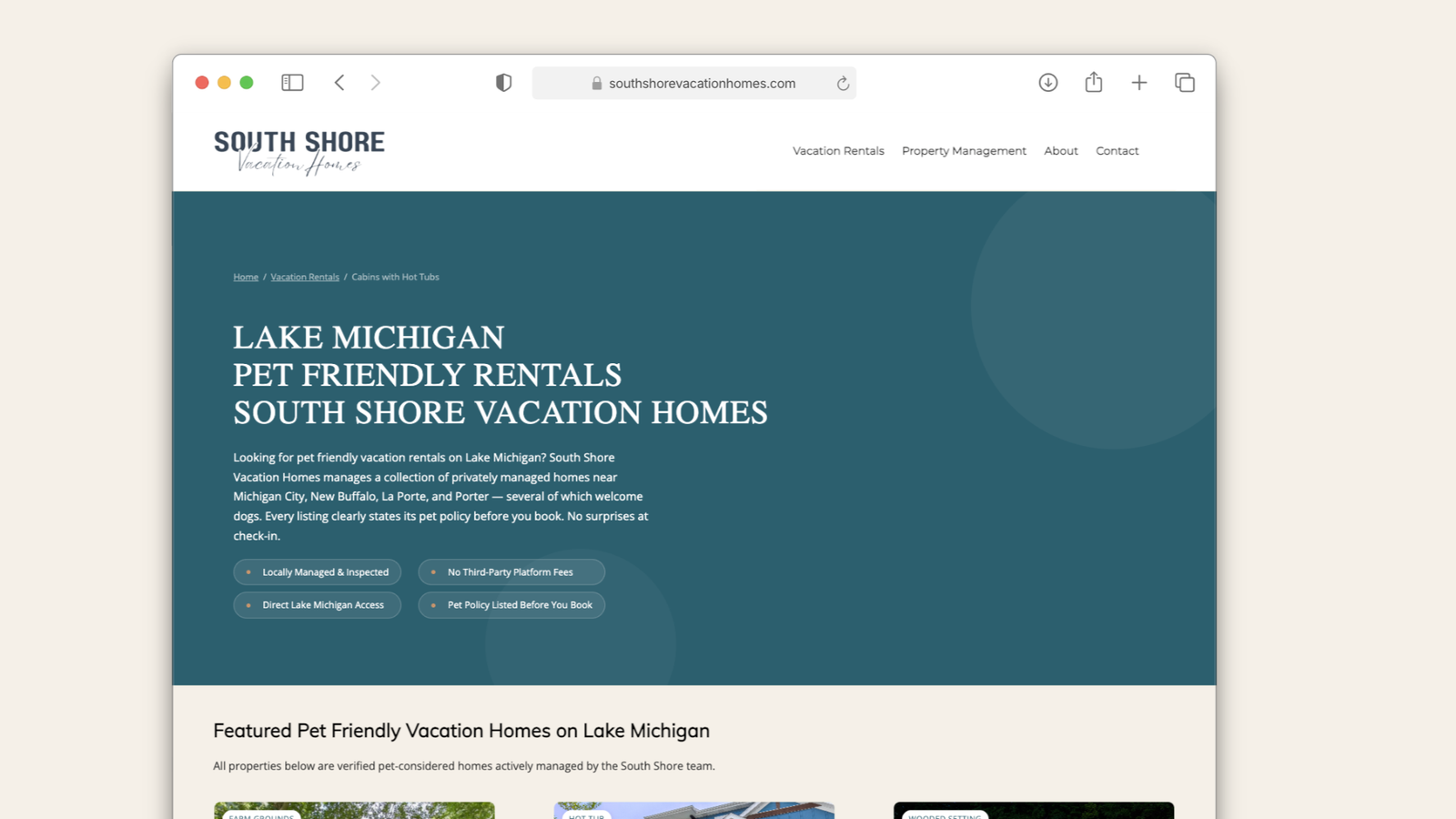 South Shore Vacation Homes offers vacation rentals across the southern Lake Michigan shoreline (New Buffalo, Michigan City, Porter, and LaPorte) just an hour from Chicago. Like most vacation rental companies, their property listings lived inside a third-party booking platform. That’s great for reservations. It’s not great for SEO.